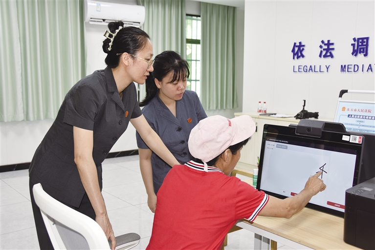 法官指导当事人线上签字确认。 记者董林 摄