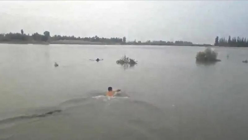 岸边支援警力迅速将另外一人救上岸。毕金豹和马木提则转身,和刚下水的3名辅警分成两组——他带着一人往红柳丛中的女子所在位置游去,马木提则带着二人朝着李宗明漂走的方向游去。