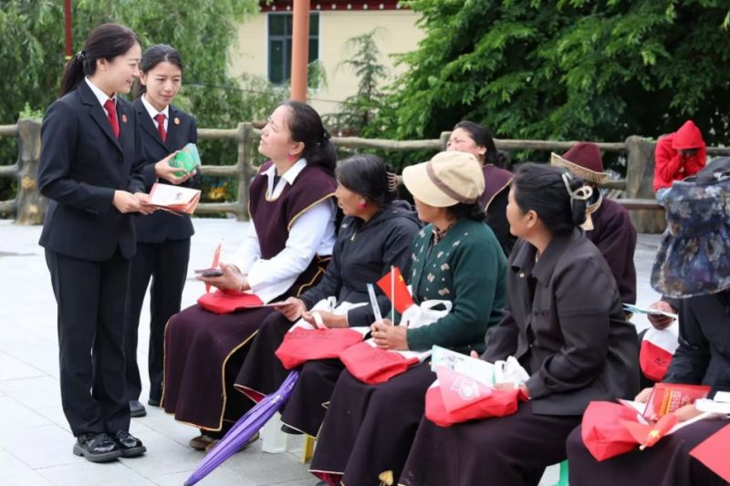 在西藏自治区林芝市巴宜区林芝镇嘎拉村,巴宜区人民法院干警组织普法活动,为村民解读民法典、青藏高原环境保护法等。记者王俏摄