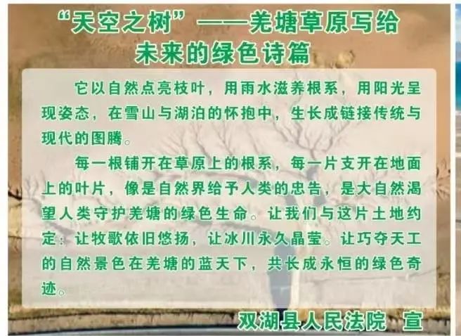 当阳光穿透稀薄的空气洒满大地,双湖措折罗玛法庭的干警们又踏上了生态守护之路,联合环保部门、生态环境管护站,行走在“天空之树”—这处因河流冲刷形成的天然地貌奇观旁,向往来游客讲解环保知识。一块块图文并茂的宣传展板立在河谷旁,从垃圾分类到生物多样性保护,从污染防治到野生动物救助,晦涩的法条在干警们的讲解下变得生动可感。当游客们认真聆听讲解,法治的种子正悄然在冻土层下生根发芽。