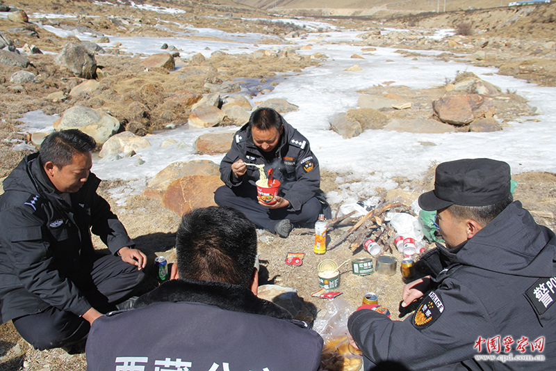崔久乡派出所时任所长索朗欧珠与同事巡逻途中休息。