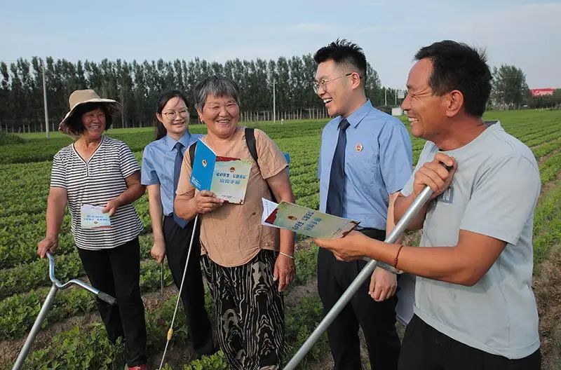 图为河南省尉氏县人民检察院驻点检察干警走访群众,发放公益诉讼宣传手册。