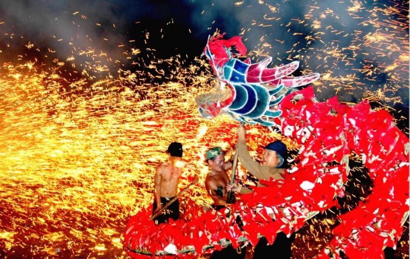 在贵州省台江县,每到元宵佳节,当地苗族同胞会用嘘花筒(苗族特制礼花)向数百条舞动的彩龙喷射火花,金色火花如瀑布般倾泻而下,舞龙者则在“火树银花”中翻腾起舞。这项延续数百年、入选国家级非物质文化遗产名录的民间传统习俗——苗族“舞龙嘘花”,因其场面壮观震撼,也被称为“勇敢者的游戏”,代表着苗族人民的勇气与智慧。