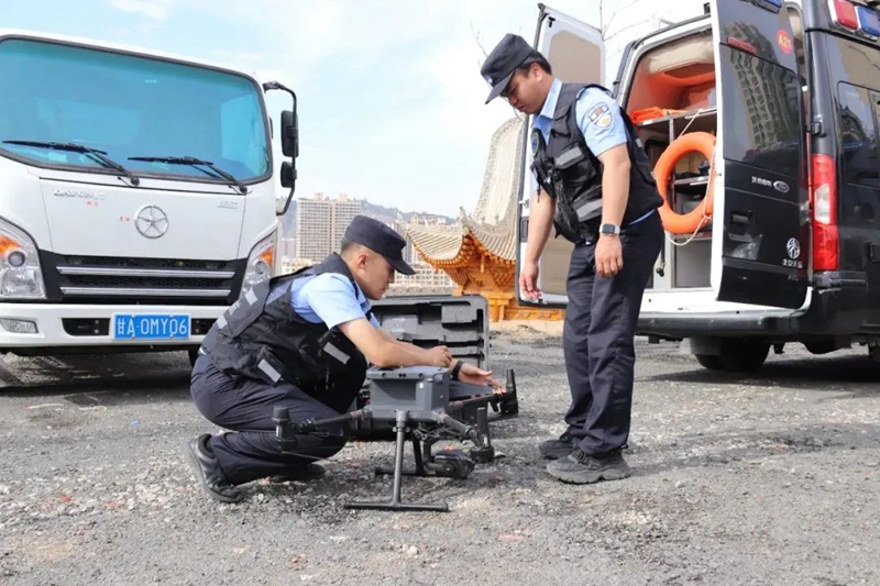 “报告分局合成作战指挥中心:我是警航作战单元,通过B区机场无人机监测,兰州老街可视范围主街区及两侧通廊约有游客1万3千人,实时画面、测算数据已向你推送,报告完毕!”“中心已收到,请保持飞行姿态,地面各执勤点位人流测算结果超过预警值时可同时将数据推送至地面执勤警力,为地面执勤警力提供决策依据。”节假日期间,分局借助无人机在兰州老街开展空中巡逻,实时监测人流密度,精准预判客流高峰,科学动态调整巡逻警力部署,实现景区警务可视化监督、数据化监测、智能化监管。
