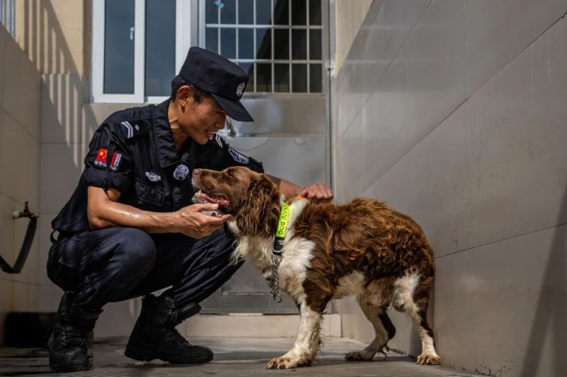 王冰波2023年参加警犬训导工作,“飞镖”是他带的第一头犬。“与其说我带‘飞镖’,不如说‘飞镖’把我领进门,我成长了,它却老了。”王冰波说。而当“飞镖”真的上了车,它又表现得十分安静。“它什么都懂……”王冰波转身的瞬间,眼泪涌出,他借着擦汗水抹了把脸。