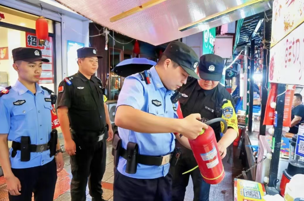 “今天周末人多,我们提前来转转。”朱宇飞一边仔细检查消防设施,一边叮嘱道:“您这煤气罐一定要固定好,收摊时千万记得关紧阀门。”