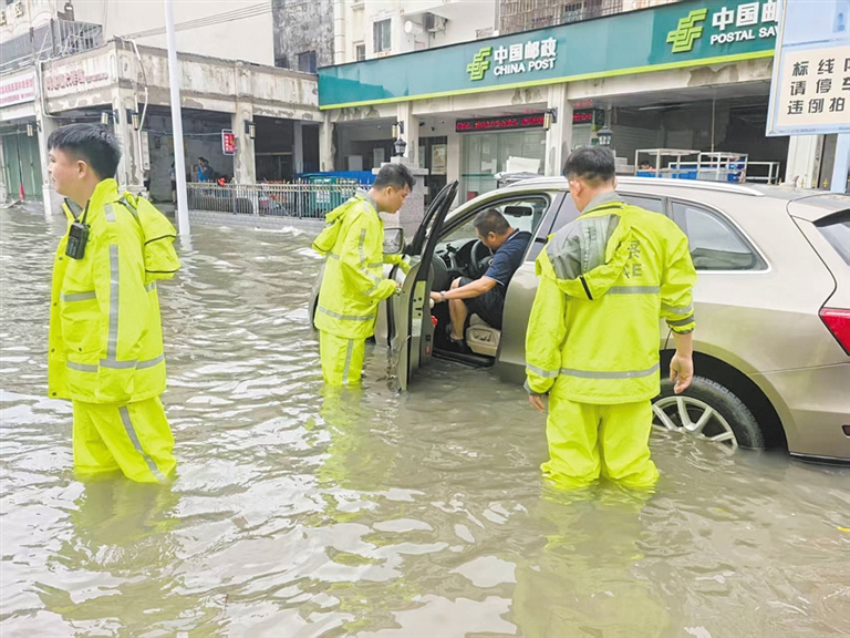 8月25日上午11时许,三亚市公安局交警支队海棠大队藤桥中队藤桥岗路管员在藤桥综合市场积水严重路段转移救助涉水事故车辆上的被困人员。(三亚交警供图)