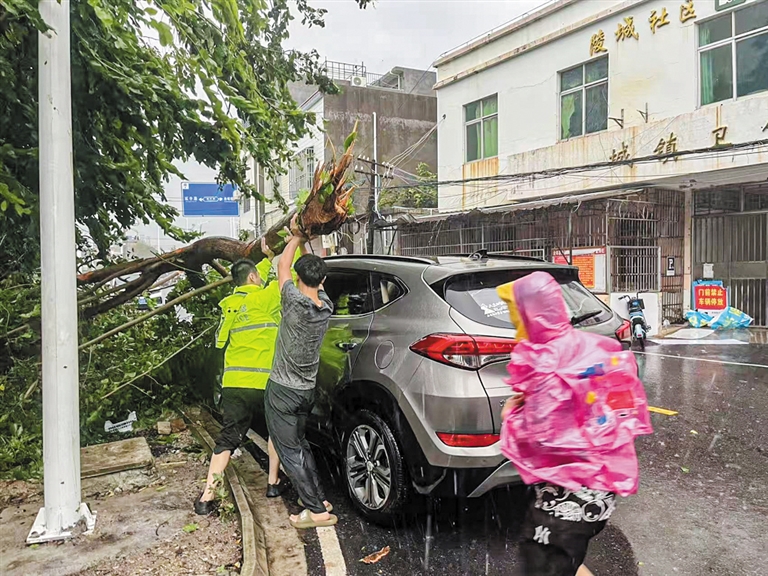8月25日,陵水黎族自治县公安局陵城派出所民警帮助受灾群众处置砸在车顶的树木。(陵水警方供图)