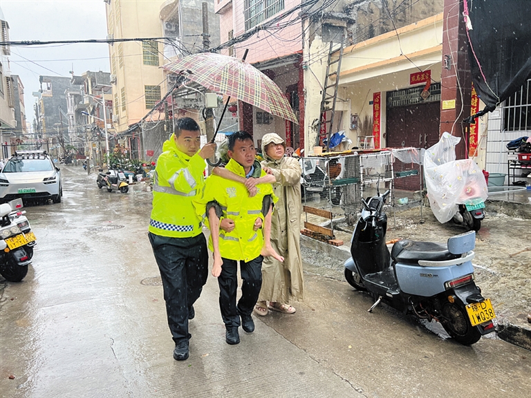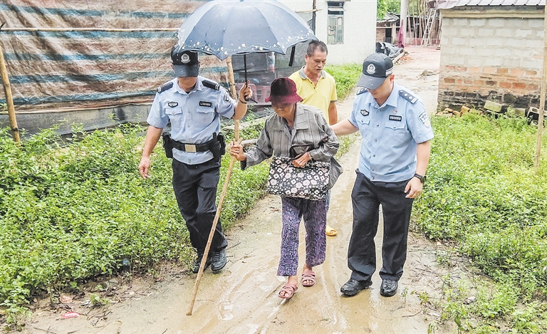 8月25日,陵水黎族自治县公安局新村港海岸派出所民警、辅警救助受灾群众。通讯员张春来摄