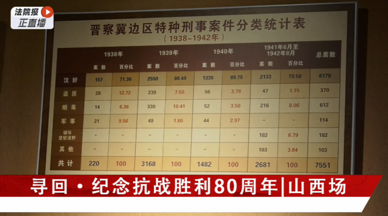 直播首先走进山西省晋中市中级人民法院内展出的“山西抗日根据地司法档案文献选展”,选展主要介绍了1937年11月太原失陷后,八路军以四面山地为屏障,先后建立起晋察冀、晋冀鲁豫、晋绥三大抗日根据地的历史。据了解,“山西抗日根据地司法档案文献选展”的内容主要以抗日战争时期晋冀鲁豫抗日根据地的司法档案,以及晋察冀和晋绥抗日根据地司法文献及辅助展品为主。这些司法档案通过原件陈列、场景再现等形式,多角度全方位地呈现山西抗日根据地司法工作的概貌,其中就包括反映山西抗日根据地对日作战情况的文献档案,反映汉奸、盗匪、烟毒、军事、破坏坚壁清野等犯罪案件的数量和占比情况的《晋察冀边区特种刑事案件分类统计表》,分析当时社会经济情况变化、为政府施策提供依据的晋冀鲁豫边区太行第三专员公署三十二年度司法工作总结,以及描绘长期受地主剥削和压榨的贫苦农民直起腰板儿与地主进行说理斗争、要求地主减租减息情形的版画《减租会》和以抗日根据地在公共场所召开群众公审大会为题材创作的油画作品《公审大会》等。