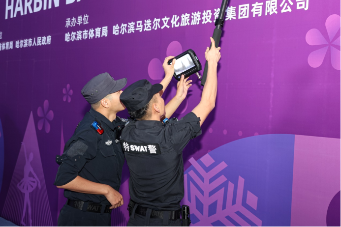面对赛事规模大、路线长、关注度高的严峻挑战,哈尔滨市公安局坚持提前谋划、精准布防,赛前开展多轮风险评估与隐患排查。赛事期间,巡特警支队组织构建“空中防控+地面守护”双线发力的安保格局。空中,无人机反制小组依托全流程管控体系,坚决杜绝“黑飞”“乱飞”;地面,采用“闸口式”人墙队形分波次放行选手,排爆安检力量无死角排查隐患,武装处突车组动态巡控,立体化防控体系高效运转。