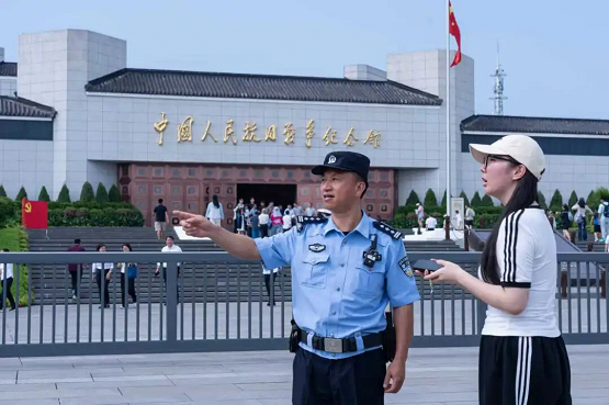2025年7月8日,中国人民抗日战争纪念馆经过展陈改造后恢复开放。当天清晨,丁黎亮就带着新警姜钧友早早到达了执勤岗位。