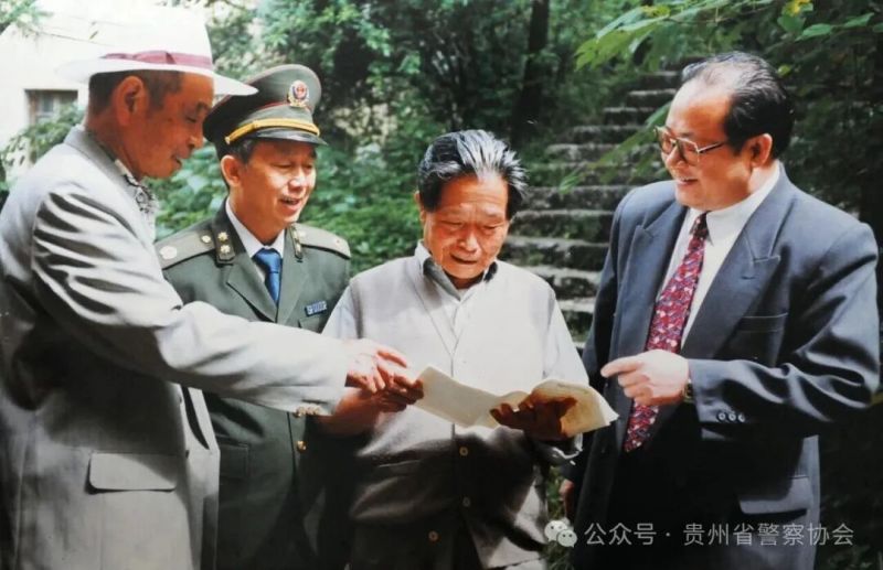 1999年,时任贵州省委常委、政法委书记、公安厅长姜延虎(右一)与老同志朱迪(右二)、张有儒(右四)、时任副厅长文明铣(右三)一起交流公安队伍建设情况