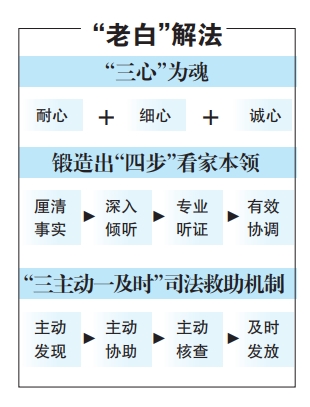 何以专解“硬疙瘩”?“老白说理”工作室团队的底气,源自“老白”37年检察生涯的深厚积淀,更来源于团队3年来的实战淬炼。这支队伍以“三心”(耐心、细心、诚心)为魂,锻造出“四步”看家本领(厘清事实→深入倾听→专业听证→有效协调),让情理法交融的“解法”惠及万千家庭。