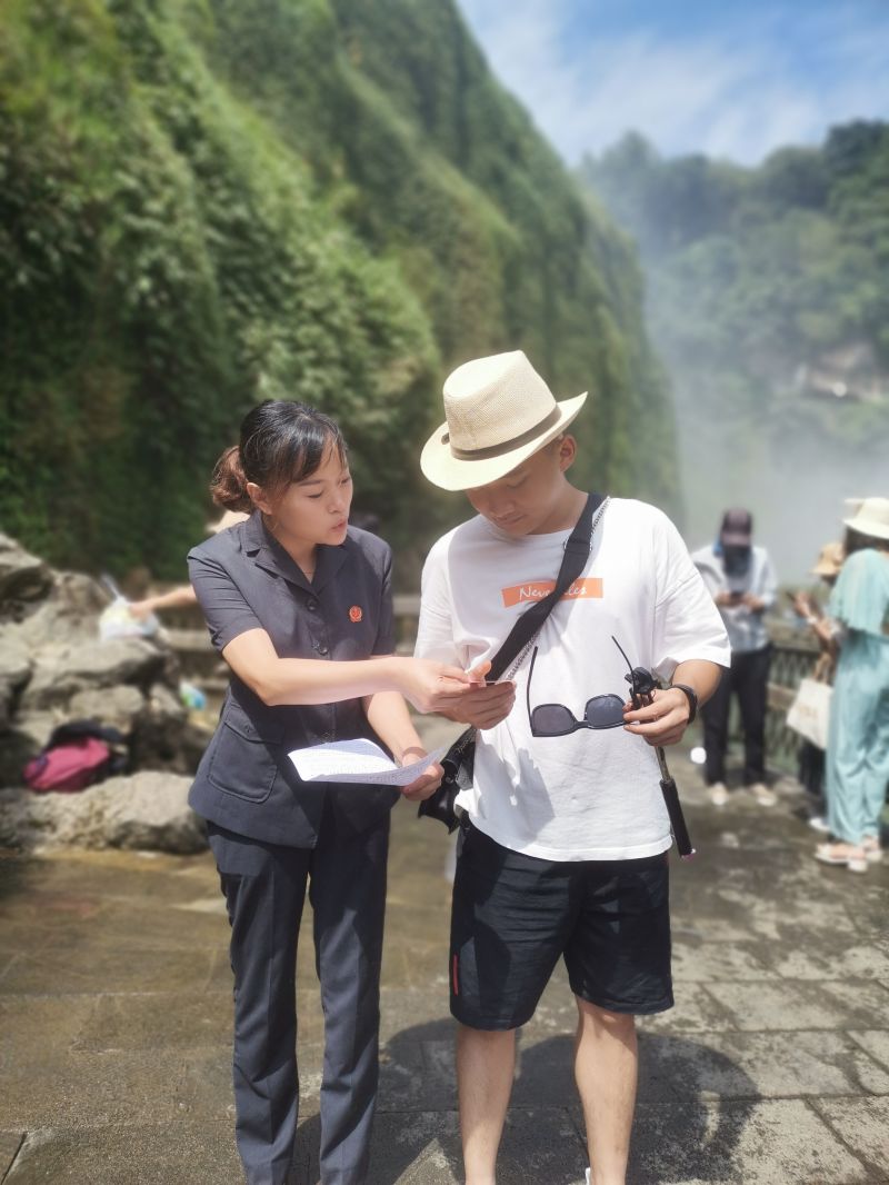 为此,镇宁法院还在日常工作中不定期对景区内的商家进行普法宣传,提高商家诚信经营意识、规范旅游市场秩序。同时,法院也会在“五一”、国庆等节假日、人流量较大时,深入景区向游客进行面对面的普法宣传,提升游客的法律意识,从而起到“将矛盾纠纷化解在基层、化解在萌芽状态”的积极效果。