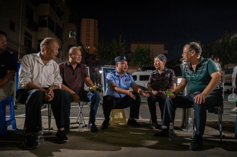 9月4日晚上,明月高悬,陕西省西安市鄠邑区工商小区广场,西安市公安局鄠邑分局甘亭派出所民警和群众围坐在一起,围绕平安话题进行“坐”谈。