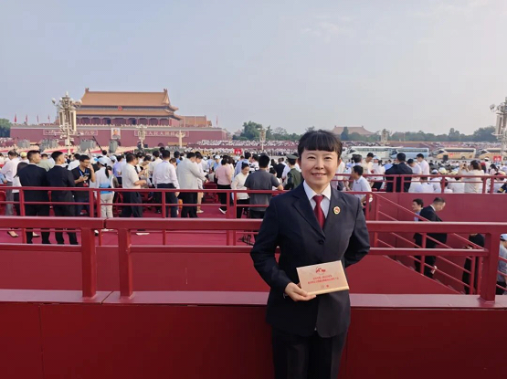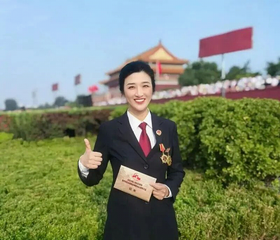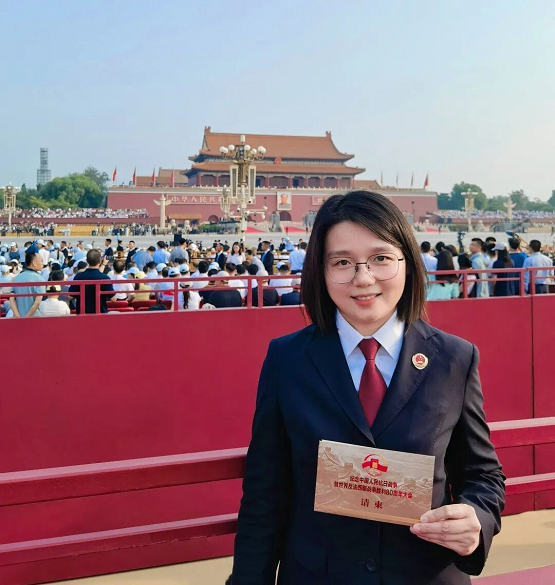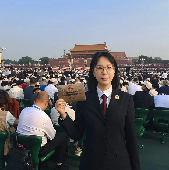 非常荣幸能够在天安门广场参加盛典,近距离观看整齐的受阅方队迈着铿锵步伐走过、先进的装备方队彰显大国底气。作为一名检察官,虽未身着戎装,但肩负守护公平正义使命,与守家卫国的力量同向而行。我将继承革命先烈和检察先辈的光荣传统,以更饱满的热情投身检察事业,以精益求精的态度践行司法为民初心,以高质效履职致敬伟大先烈和时代楷模,为伟大祖国增光添彩,奋力描绘更加壮美祥和的发展画卷。