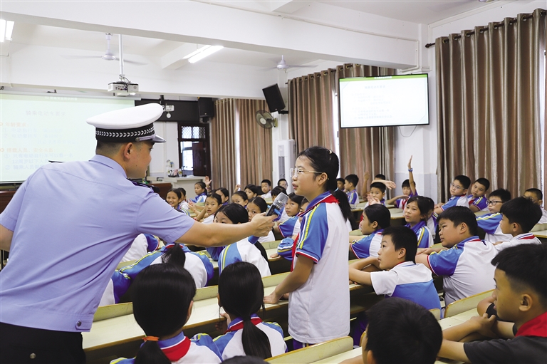 在一问一答间,学生们掌握了必要的交通安全知识,养成文明交通、文明出行的良好习惯。欢声笑语中,交通安全的种子悄然播撒进学生们的心田,在校园中萌芽。