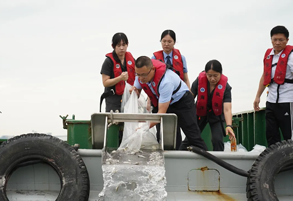 渔民们早早候在码头。“法官,用我家的船吧!”“我家这条大一点,载得多……”十余名渔民纷纷表示愿意无偿出借舢板,还主动要求参与鱼苗投放。洪秀娟和书记员乘上了渔民老陈的舢板。这条舢板,九年前还曾用来运输采砂船零配件,如今满载着即将回归大海的黄鳍鲷鱼苗,慢慢驶离岸边。