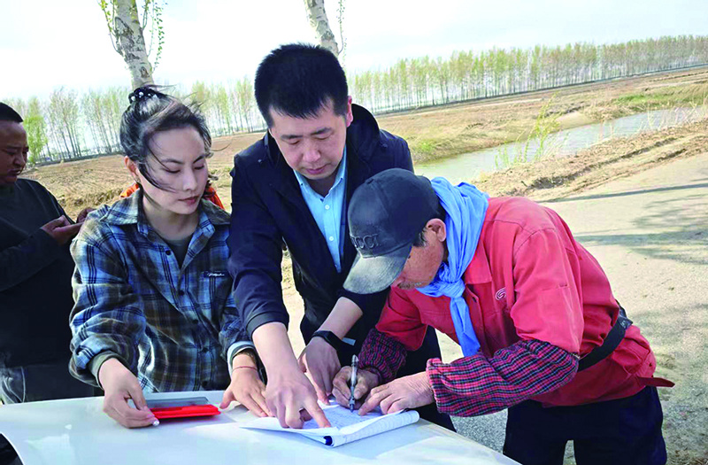 在盘山县陈家镇,调解人员与当事人商议土地边界划分方案。
