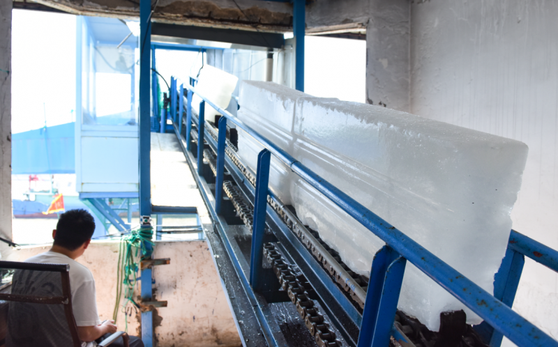 记者观察到,东门渔村因其特殊地理位置,沿海渔村距离码头的位置十分靠近,渔民几乎不出50米就能从自家登船。一众制冰厂就搭建在渔村村居之间,几乎每个码头都有输冰机。高高架起的输冰机直接将冰砖从制冰厂输送到渔船上。