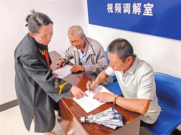 图为经过黑龙江省尚志市人民法院帽儿山人民法庭副庭长贺聪聪调解,双方当事人签订和解协议