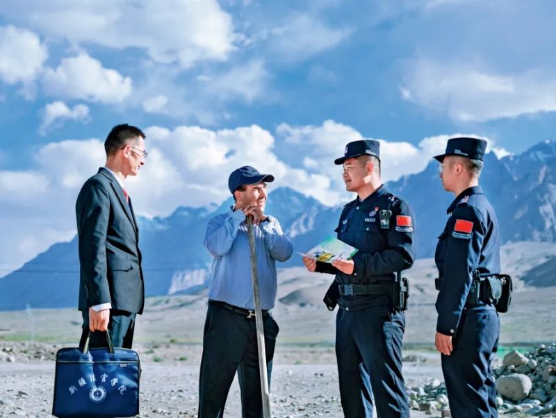 2024年7月22日,新疆喀什边境管理支队塔什库尔干边境派出所联合塔什库尔干县人民法院法官走进辖区农牧民生产作业点宣讲法律法规,解答群众疑难问题。视觉中国王九峰/摄