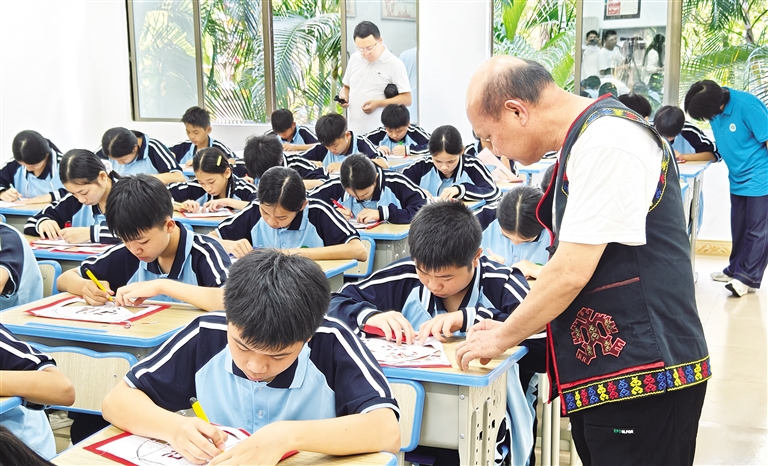 9月18日,乐东中学“法治剪纸”课堂上,剪纸课指导老师吉雄给孩子们做辅导讲解。记者覃创源 摄