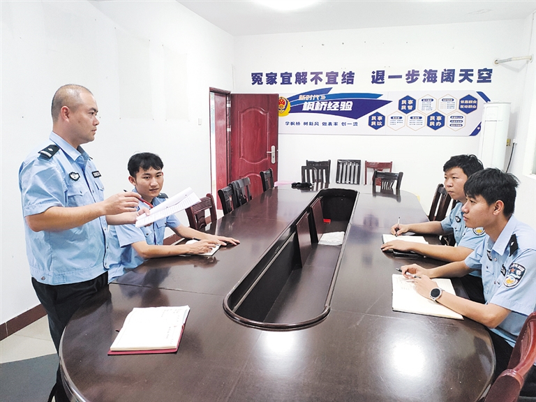 白沙邦溪派出所民警林丰和同事研判案情。记者宋飞杰 摄