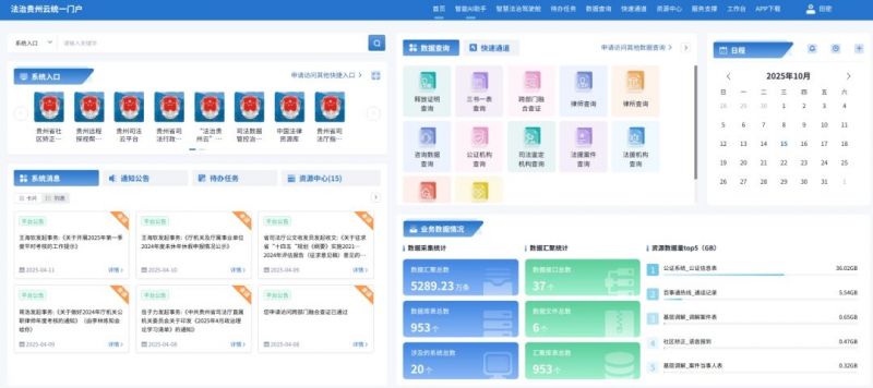 ——移动办公统一入口,则与贵州省政府“贵政通”平台融合,打造了全省统一的司法行政移动办公平台。工作人员通过手机就能安全地登录“法治贵州云”,实现信息推送、业务办理、进度掌握,办公不再受时间地点限制。