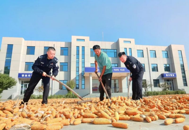 天刚放晴,抢晒新收的玉米成为农户们的头等大事。以往,村民们为了抢农时,可能会选择在马路甚至行车道上晾晒,埋下巨大的交通安全隐患。为解决这一实际问题,冠县公安局交管大队乡镇二中队主动敞开大门,按照上级统一部署,迅速通过微信群、电话联系附近村居支部书记,向农户们发出暖心邀约:“欢迎到中队门前和院内空地集中晒粮!”