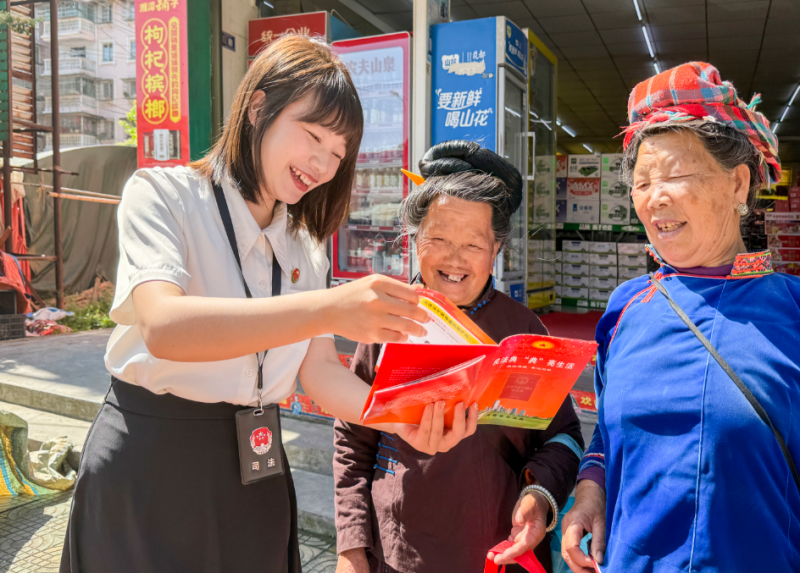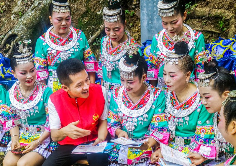 图为榕江县司法局开展法治宣传进农村,志愿者在向少数民族妇女开展普法宣传。