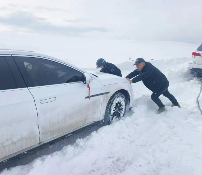 此时能见度持续恶化,警车在积雪路面上谨慎前行,每一次转向都可能打滑。抵达现场后,民警第一时间送上热水,待受困者稍事恢复,便立即展开救援。两人负责铲雪清路,两人指挥警车准备拖车。