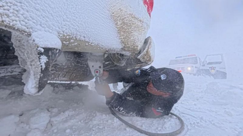 此时能见度持续恶化,警车在积雪路面上谨慎前行,每一次转向都可能打滑。抵达现场后,民警第一时间送上热水,待受困者稍事恢复,便立即展开救援。两人负责铲雪清路,两人指挥警车准备拖车。