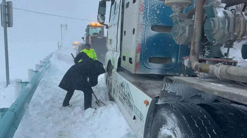 10月13日正午时分,五辆满载货物的卡车在前往新疆塔城和丰县途中,车轮深陷积雪。重载的车身在雪中不断下陷,积雪很快淹没了大半个车轮。司机们多次尝试脱困,却在湿滑的路面上进退两难。危急时刻,达因苏边境派出所的报警电话成了他们最后的希望。