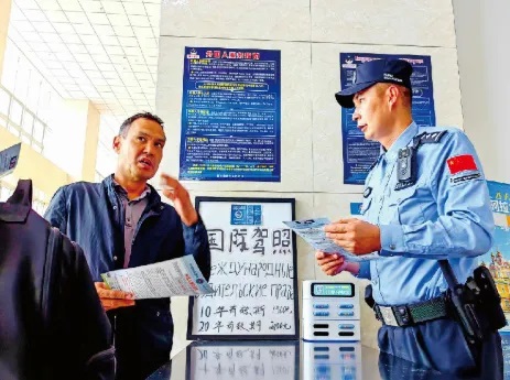 2024年9月,在霍尔果斯国际客运站外国人管理服务站,民警向游客提供法律咨询。石榴云/新疆法治报记者王晨摄