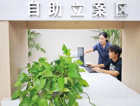 9月15日,喀什市人民法院自由贸易试验区喀什片区人民法庭法官(左)指导群众在自助立案区填写申请立案材料。石榴云/新疆法治报记者赵书城摄