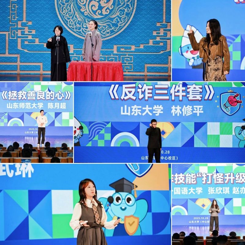 为深入贯彻落实党中央、国务院关于打击治理电信网络诈骗决策部署,10月28日,“青年反诈在行动”进校园宣传活动在山东大学成功举办。本次活动采取“室内脱口秀展演+室外游戏互动”形式,为来自山东大学、山东师范大学、济南大学等10余所高校的学生带来一场精彩纷呈、别开生面的反诈安全知识盛宴。