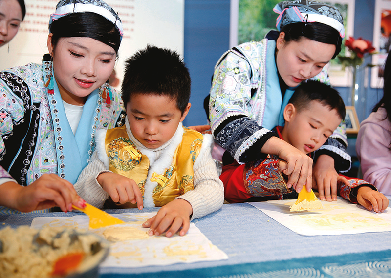 图为孩子们在福泉市非遗馆体验豆染技艺。