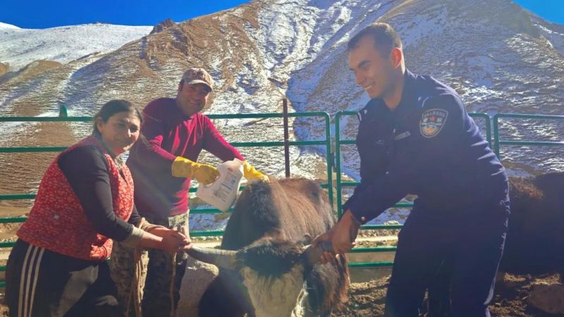 与这片丰收的喜悦遥相呼应,在数十公里外的三连,雪山已染上零星白雪。辅警肉斯塔木正蹲在牦牛群旁,熟练地调配药浴药液。“每头牛都要泡到位,这样驱虫效果才好。”他一边引导牧民将牦牛赶入水池,一边重复着注意事项。冰冷的药水溅湿了裤脚,他却毫不在意。历时3个多小时,为牧民艾合买提家的30多头牦牛全部完成了药浴,他才松了口气。牧民们望着他冻得发红的脸颊,竖起了大拇指。
