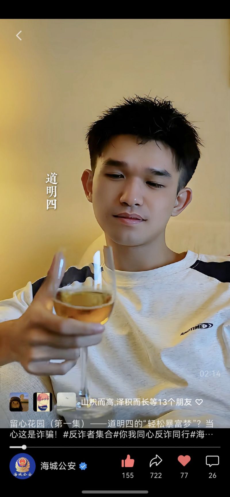 2024年新警李涛在反诈短剧《留心花园》中扮演“道明四”深受好评。