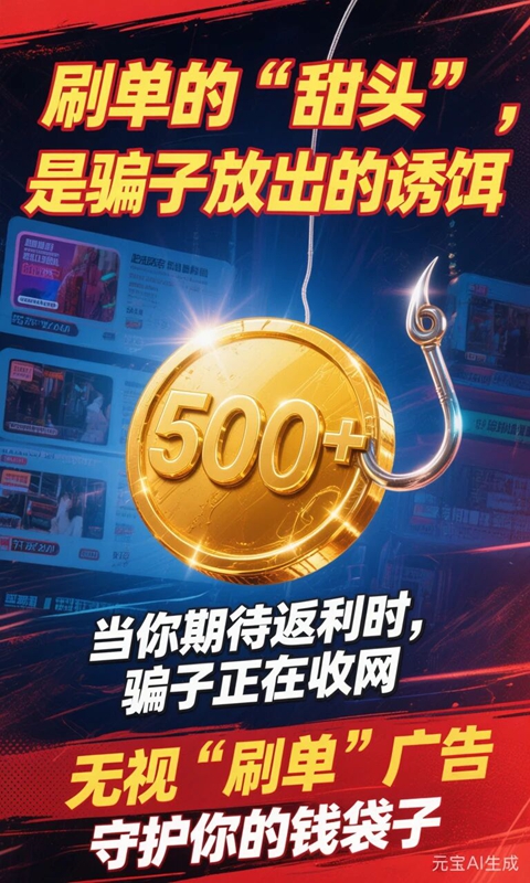 “双十一冲销量!急招刷单员,日结500+,手机就能做!”这种广告是不是看着眼熟?骗子先让你刷几单小额的,10元返20元,20元返30元,让你尝点甜头放松警惕。等你信了,开始刷上千的大单,人家立刻变脸:“对不起哦亲,系统卡单了、任务超时了,您得再刷三单联单才能返款哦!”你咬牙刷了,等来的不是返款,是拉黑!