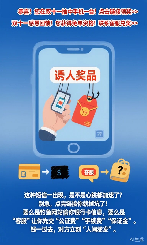 “恭喜!您在双十一抽中手机一台!点击链接领奖>>”“双十一感恩回馈!您获得免单资格!联系客服兑奖>>”这种短信一出现,是不是心跳都加速了?别急,点完链接你就掉坑了!要么是钓鱼网站偷你银行卡信息,要么是“客服”让你先交“公证费”“手续费”“保证金”。钱一过去,对方立刻“人间蒸发”。