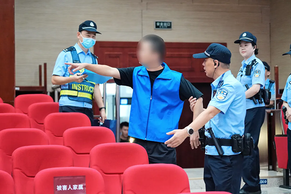 9时,案件如期开庭。被告人轮流接受法庭询问和调查,在他们身后,两名法警目光如鹰,聚精会神地关注着现场动态。汗水已将警服浸湿,法警岿然不动。