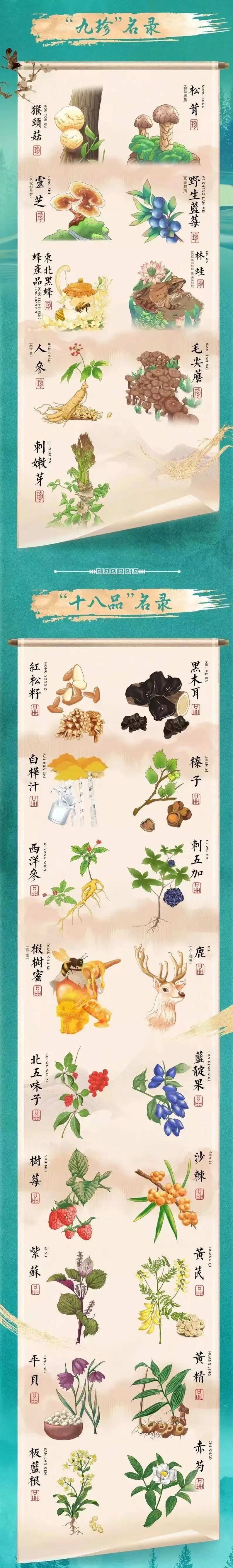 “九珍”:以珍稀、珍贵、珍馐为标准,包括猴头菇、松茸、灵芝、野生蓝莓、黑蜂蜂产品、林蛙、人参、毛尖蘑、刺嫩芽,突出自然馈赠的稀缺性与高价值。