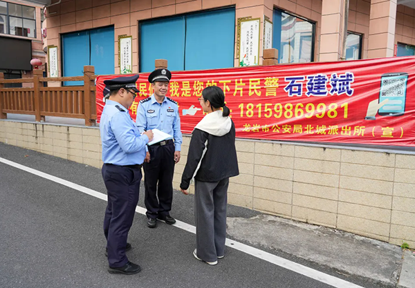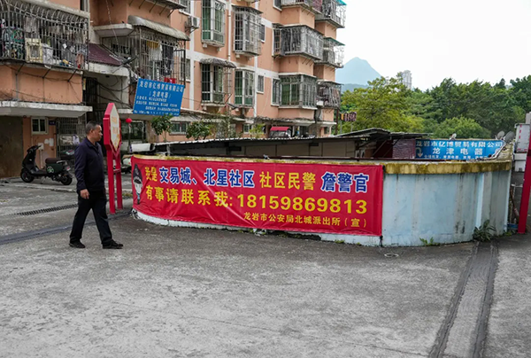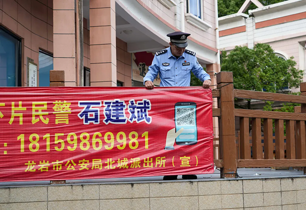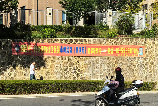 漫步福建龙岩城区的各社区,路口街角、居民楼边,常能看到一抹抹亮眼的红色横幅——“居民们,我是您的社区民警XXX,有事联系我→电话:xxxxxxxxxxx”。