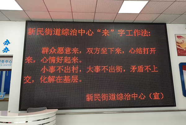 新民街道综治中心的大屏上播放着的“来”字工作法