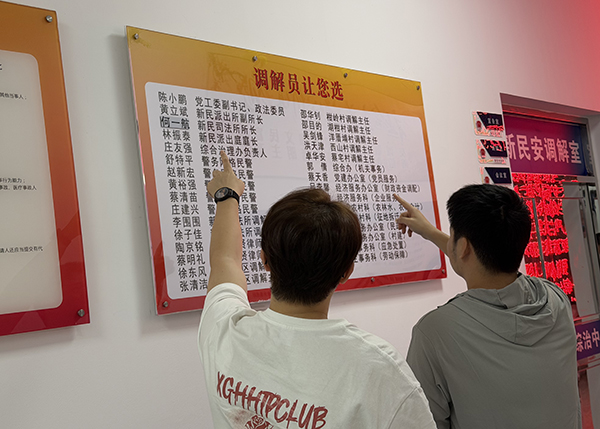 “遇到群众来求助,他们都会参与调解。”综治中心工作人员表示,群众也可以自主选择调解员。在综治中心的展示墙上,有一块醒目的“调解员您来选”标语,下面列着综治中心成员单位业务骨干及新民司法所一级调解员的名字。