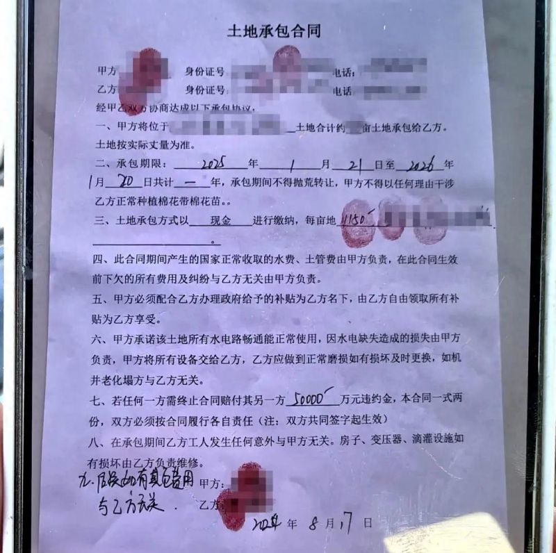 2024年8月,承包户陈先生与31团土地出租人王先生签定了一笔关于318亩棉花地的土地承包合同,地块位于辖区G218国道871公里处。双方签定的合同中明确约定,承包费用中包含土地使用费、水费、电费等相关费用共计每亩1150元,期限为1年,自2025年1月21日生效,至2026年1月20日承包期结束,双方当时在签定合同时,均表示对合同内容无异议,并顺利完成签定。