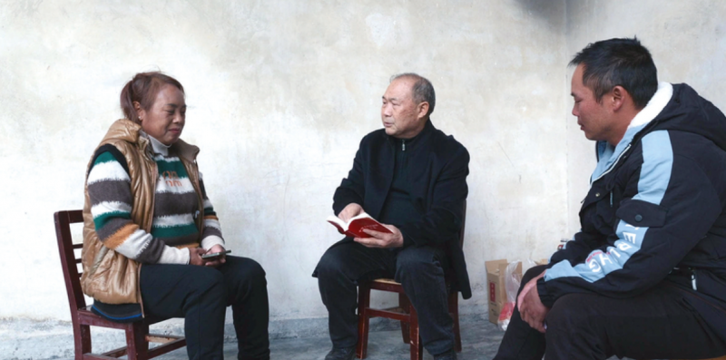 图为黄平县法律明白人王清华(中)为当地村民宣传讲解《民法典》。